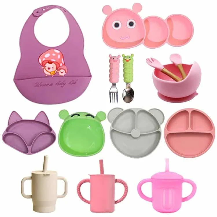 A wide assortment of silicone baby feeding products including plates, bowls, cups, bibs, and utensils, suitable for custom branding and bulk supply.