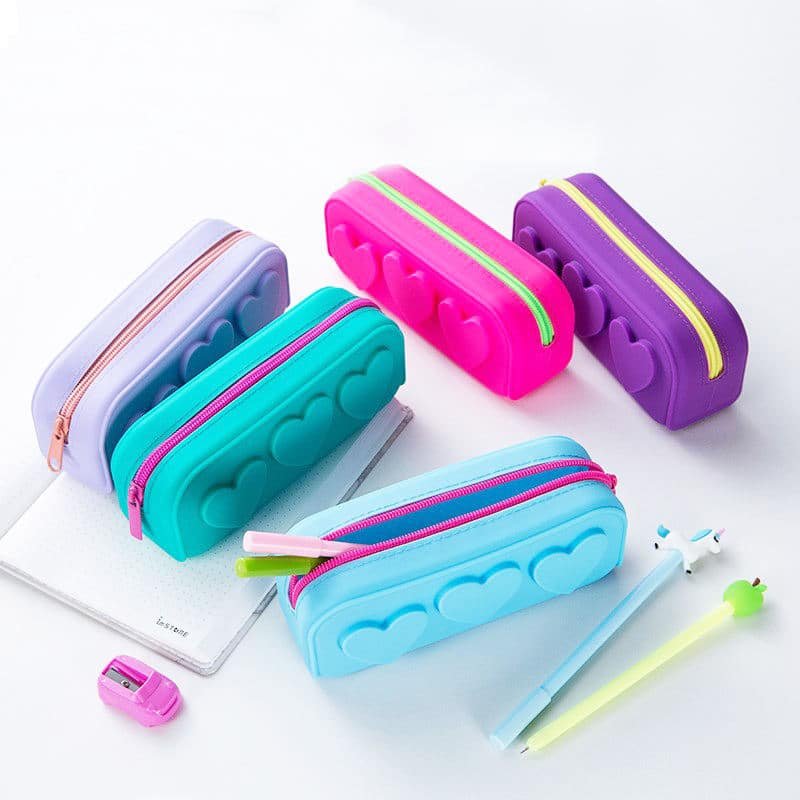 Bright, flexible, and durable silicone pencil case featuring embossed heart patterns. Perfect for school, office, or promotional OEM projects with fully customizable colors and zippers.